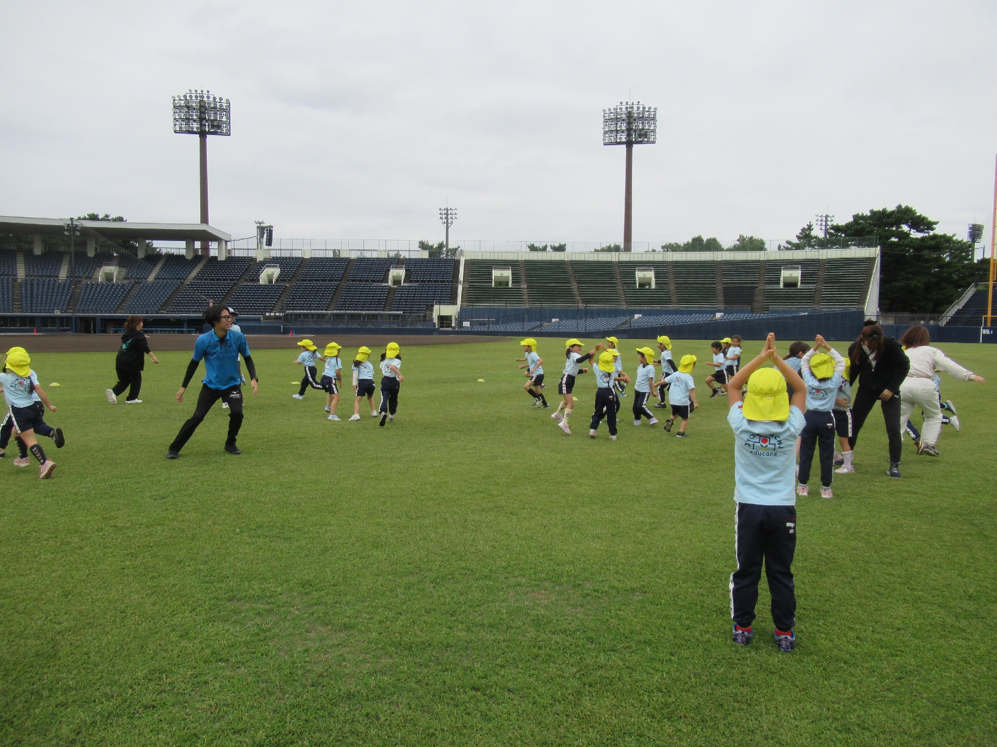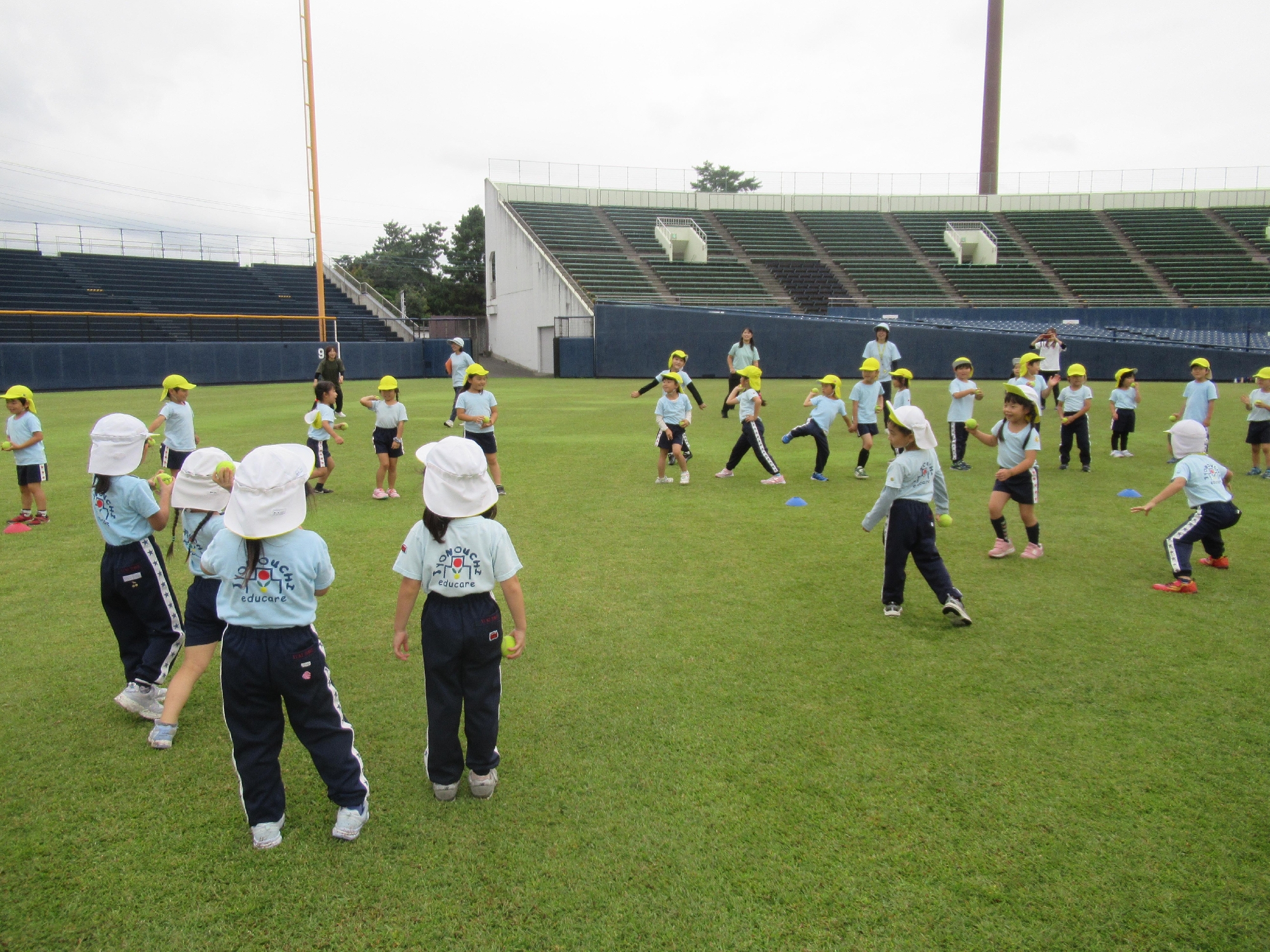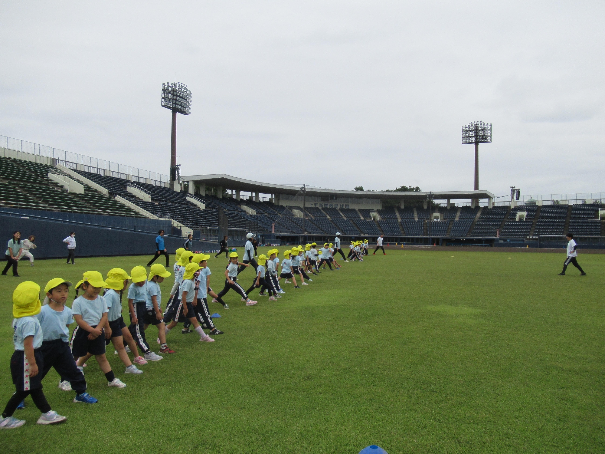 敷島球場の広さを満喫!準備体操をしっかりしています。