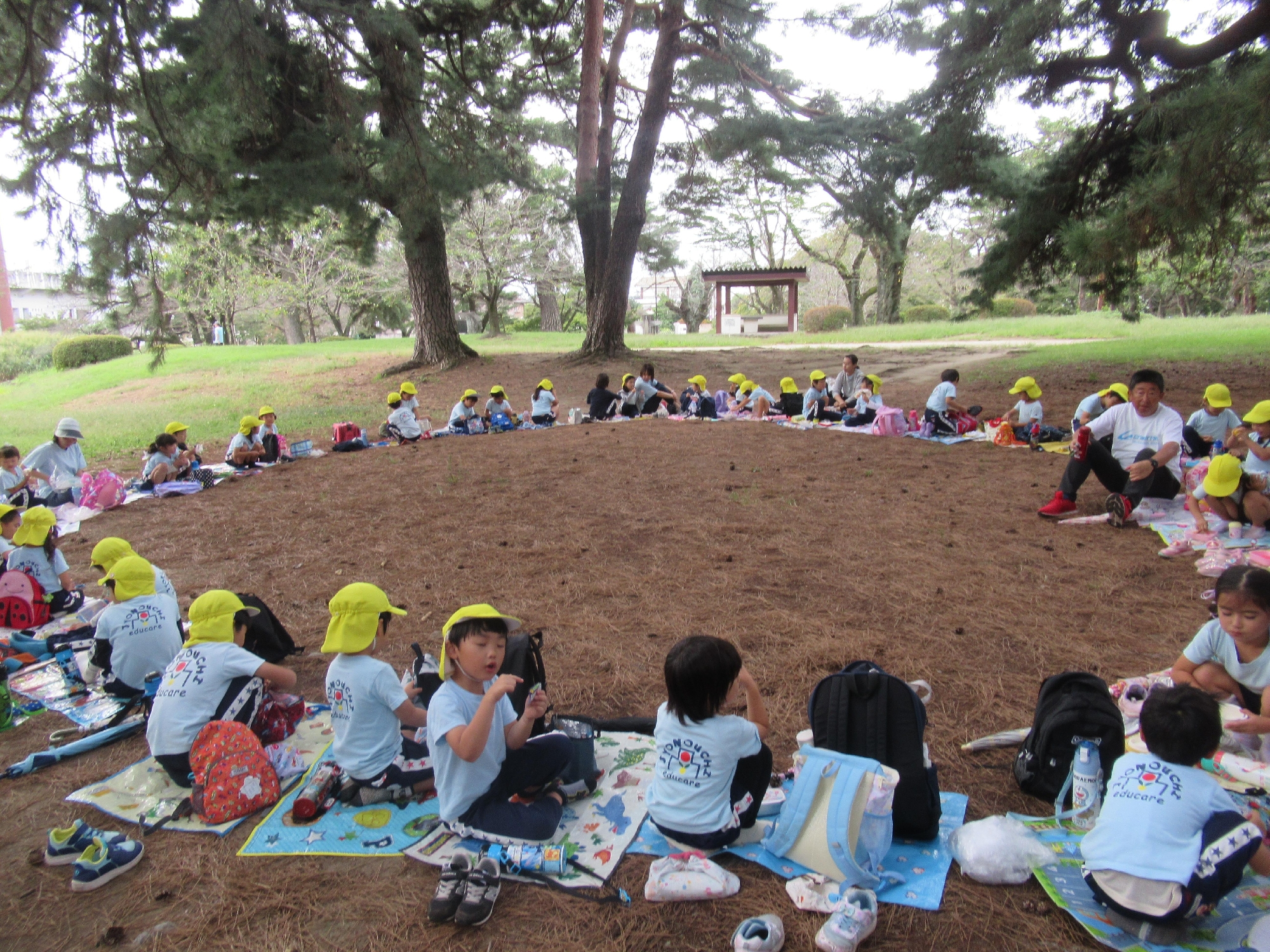 松ぼっくりもたくさん落ちていました。秋らしい景色の中、全員で大きな輪になりお弁当をいただきました。