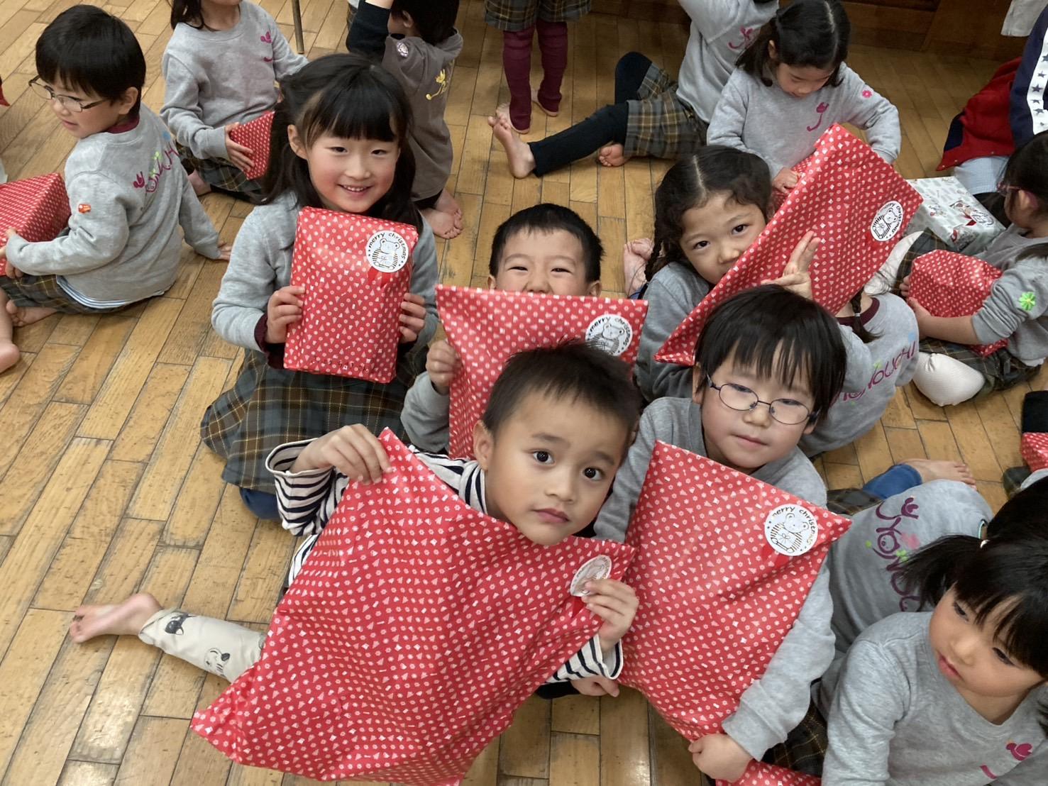 たんぽぽ組、れんげ組、つくし組は各クラスで歌をうたい、絵本を読んでからサンタさんの登場! 少しびっくりした表情の子どもたちでしたが、少しずつ慣れてきて嬉しそうにプレゼントをもらうことができました。「ありがとう」と言える子もいましたよ。