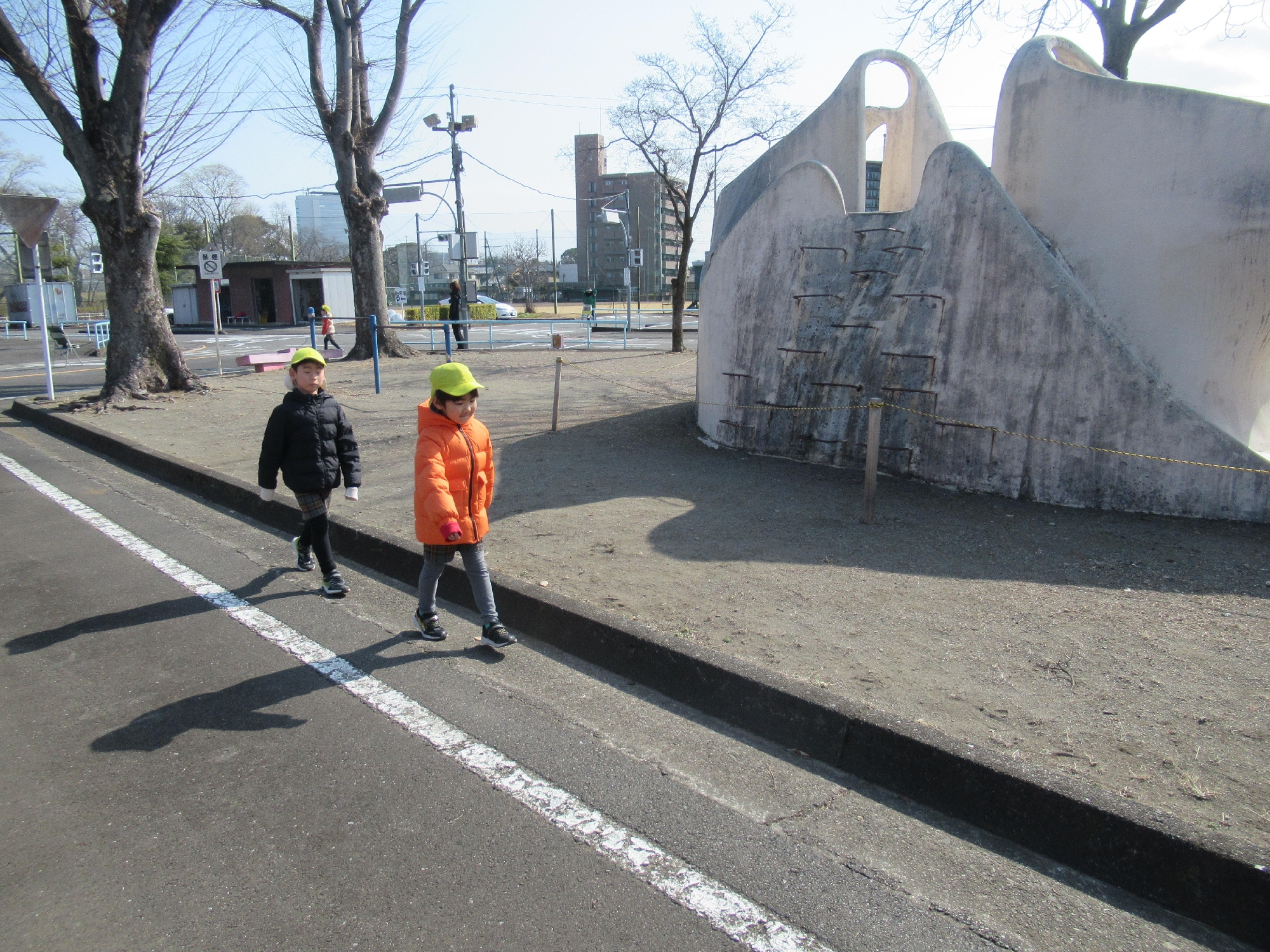 教室で学んだ後、外に出て交通公園内を歩きました。2人ペアになり、気をつけるポイントを確認していきました。